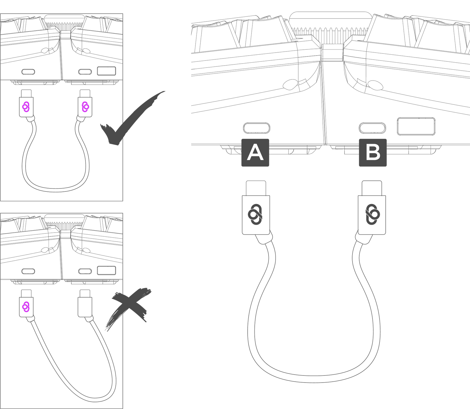 Insert the USB-C (rounded) side of the longer cable into the keyboard and the USB-A side (rectangle end) into the computer.