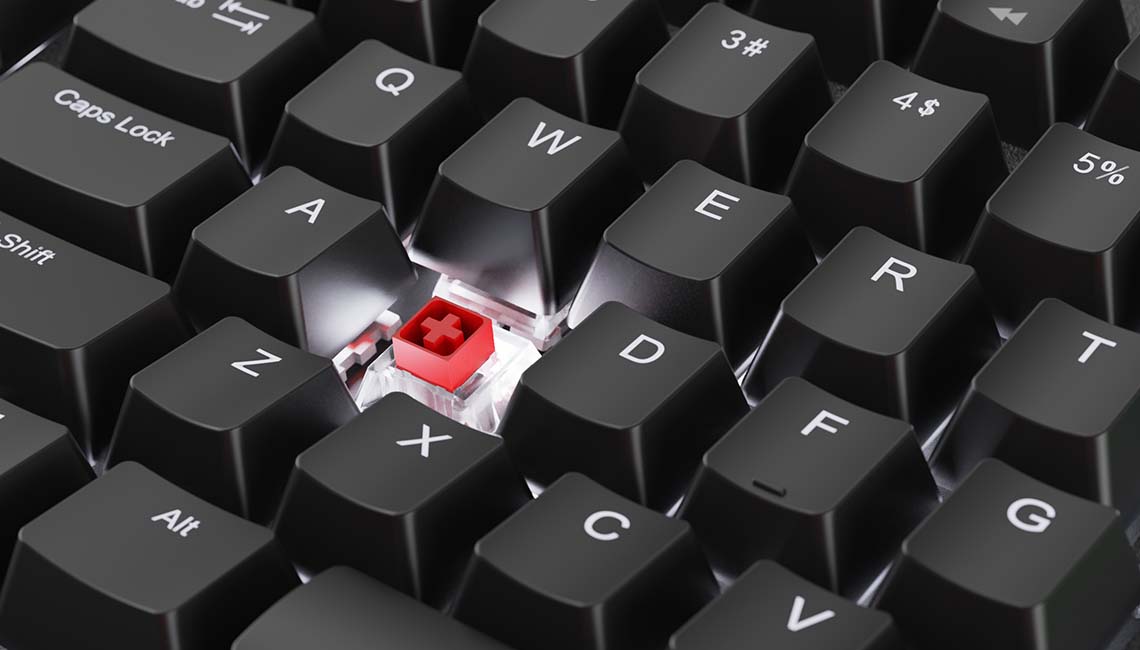 A smooth and linear feel with very low audible click makes the RED switch perfect for speedy typing and quieter environments.
